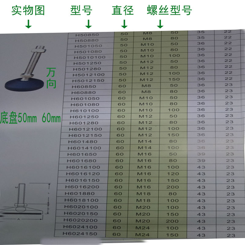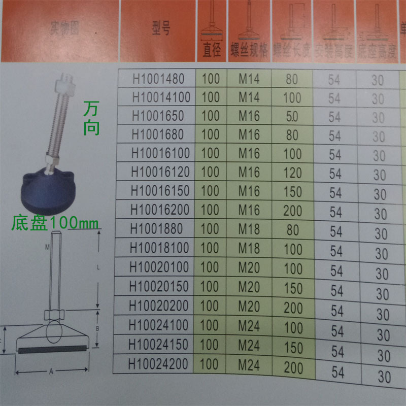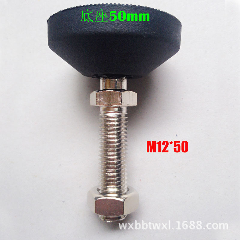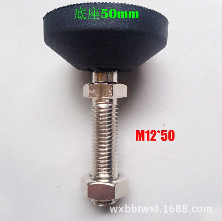 該款產(chǎn)品為萬向調(diào)節(jié)腳系列:12*50-50.螺桿M12.螺桿長度50mm,底座直徑為50mm.底座尼龍材質(zhì),螺桿碳鋼鍍鎳。